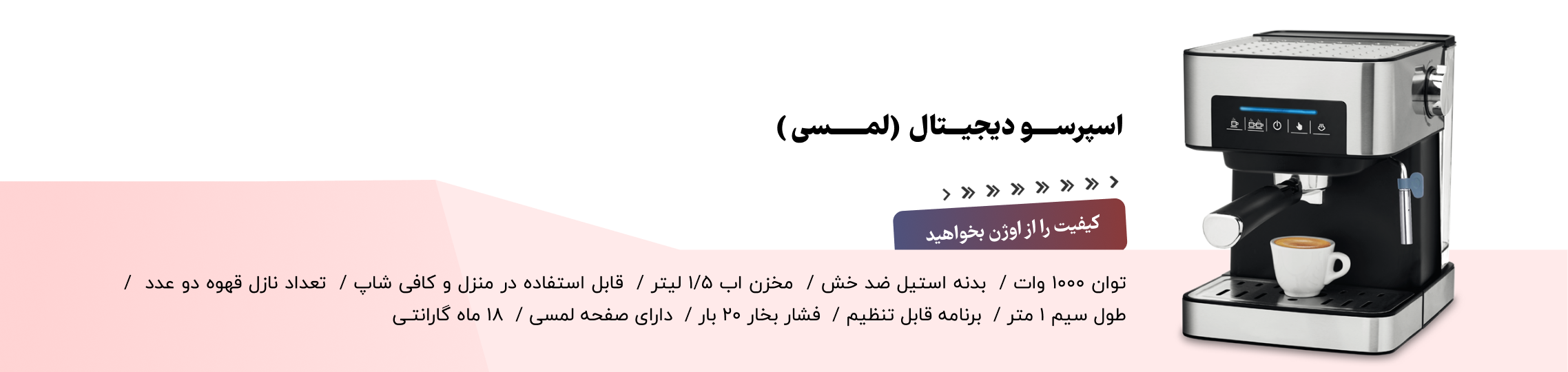 اگر بهدنبال یک اسپرسو ساز حرفهای و دیجیتال با طراحی شیک و امکانات پیشرفته هستید، همین حالا با اسپرسو ساز دیجیتال ۱۰۰۰ وات، کیفیت کافیشاپ را به خانه یا محل کارتان بیاورید!